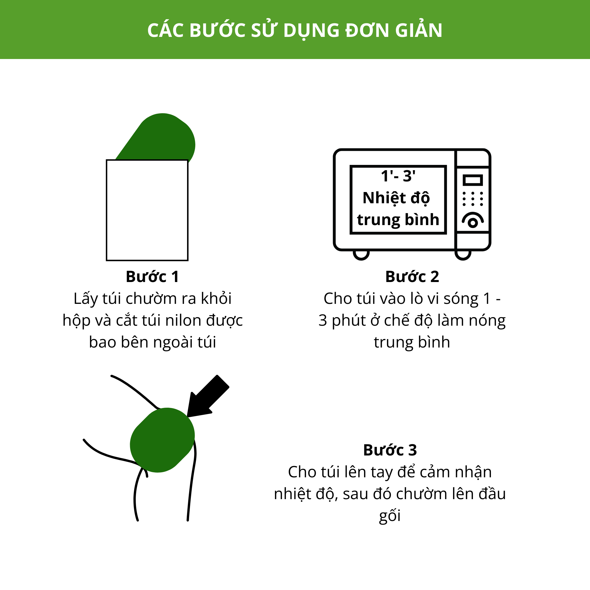 Hướng dẫn sử dụng: Đặt gối vào lò vi sóng làm nóng 1-3 phút ở 60 độ sau đó mang ra sử dụng.