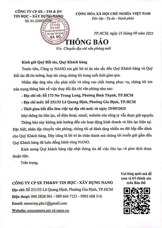 Thông báo này không ảnh hưởng đến các hoạt động kinh doanh và liên lạc hiện tại. Đặc biệt, nhân dịp chuyển văn phòng, chúng tôi sẽ dành tặng nhiều ưu đãi hấp dẫn dành cho Quý Khách hàng. Đây cũng là lời tri ân chân thành mà chúng tôi muốn gửi gắm đến Quý Khách hàng đã luôn đồng hành cùng NANO.