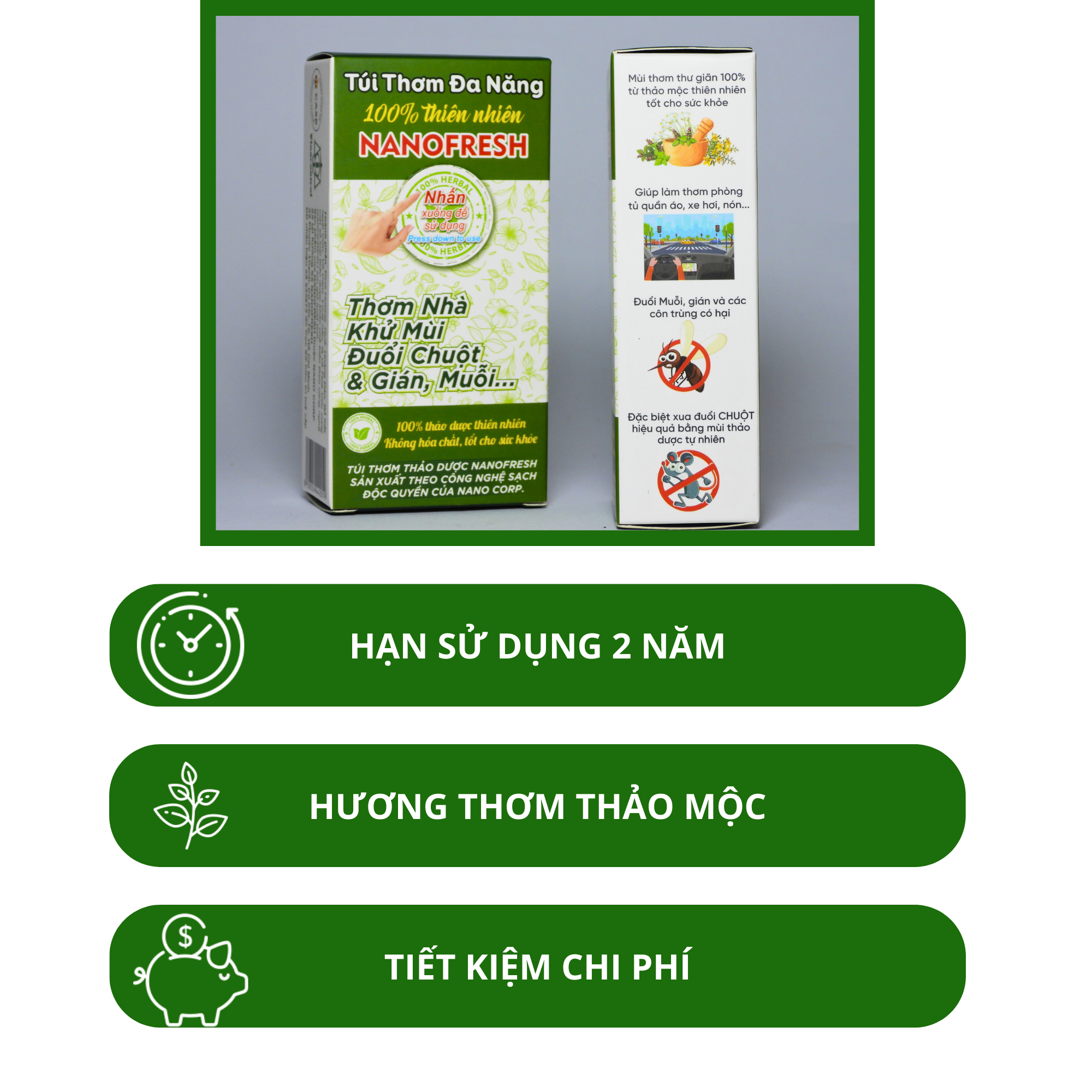 Hương thơm từ tinh dầu tự nhiên của các loại thảo dược giúp thơm nhà, văn phòng, xe hơi, tủ quần áo, nón bảo hiểm, ….khử mùi hôi, ẩm mốc, tiêu diệt vi khuẩn gây bệnh đường hô hấp. Giúp thư giãn và xua đuổi rất hiệu quả gián, muỗi, các loài côn trùng và đặc biệt có tác dụng đuổi chuột ra khỏi khu vực có đặt túi thơm NANO FRESH.